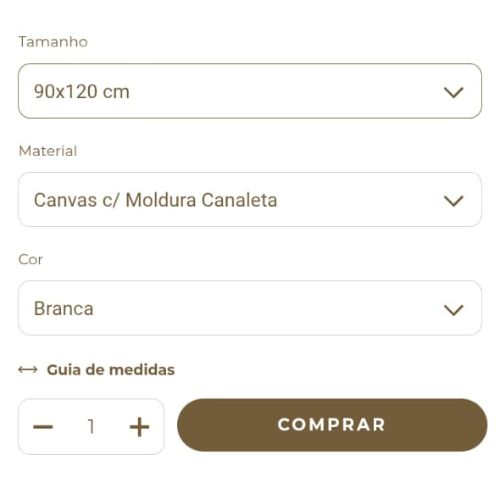 Escolha o tipo do quadro na opção material: MOLDURA FILETE, MOLDURA CAIXA ou CANVAS MOLDURA CANALETA. Em seguida escolha o tamanho de seu quadro e também a Cor da Moldura. Feito isso então clique em Comprar depois clique em Ver Carrinho.