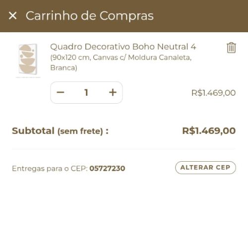 Insira seu CEP para ver as opções de entrega disponíveis, como prazos e custos de frete. Fique atento pois temos retirada gratuita em várias lojas FASTFRAME, opção exclusiva para a cidade de São Paulo. Coloque seu Cep e verifique se há opção para retirada. Conferido tudo isto clique em INICIAR COMPRA.
